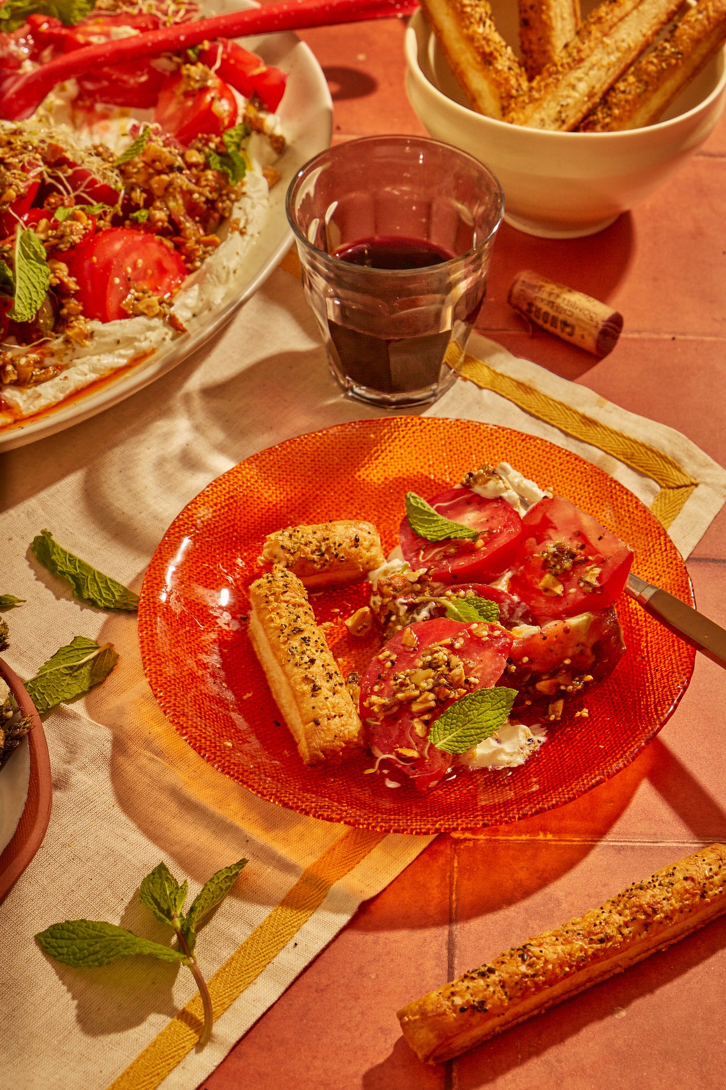 Welcome the land of the cheaters. Here, when we want a fancy party app without the trouble, we roll out some puff pastry, brush it with olive oil, and cut it into strips. A sprinkle of everything bagel seasoning goes on top, and eight to ten minutes in the oven at 425 later, we dip the breadsticks into something glamorous like this spicy yogurt dip. Easy and delicious!
