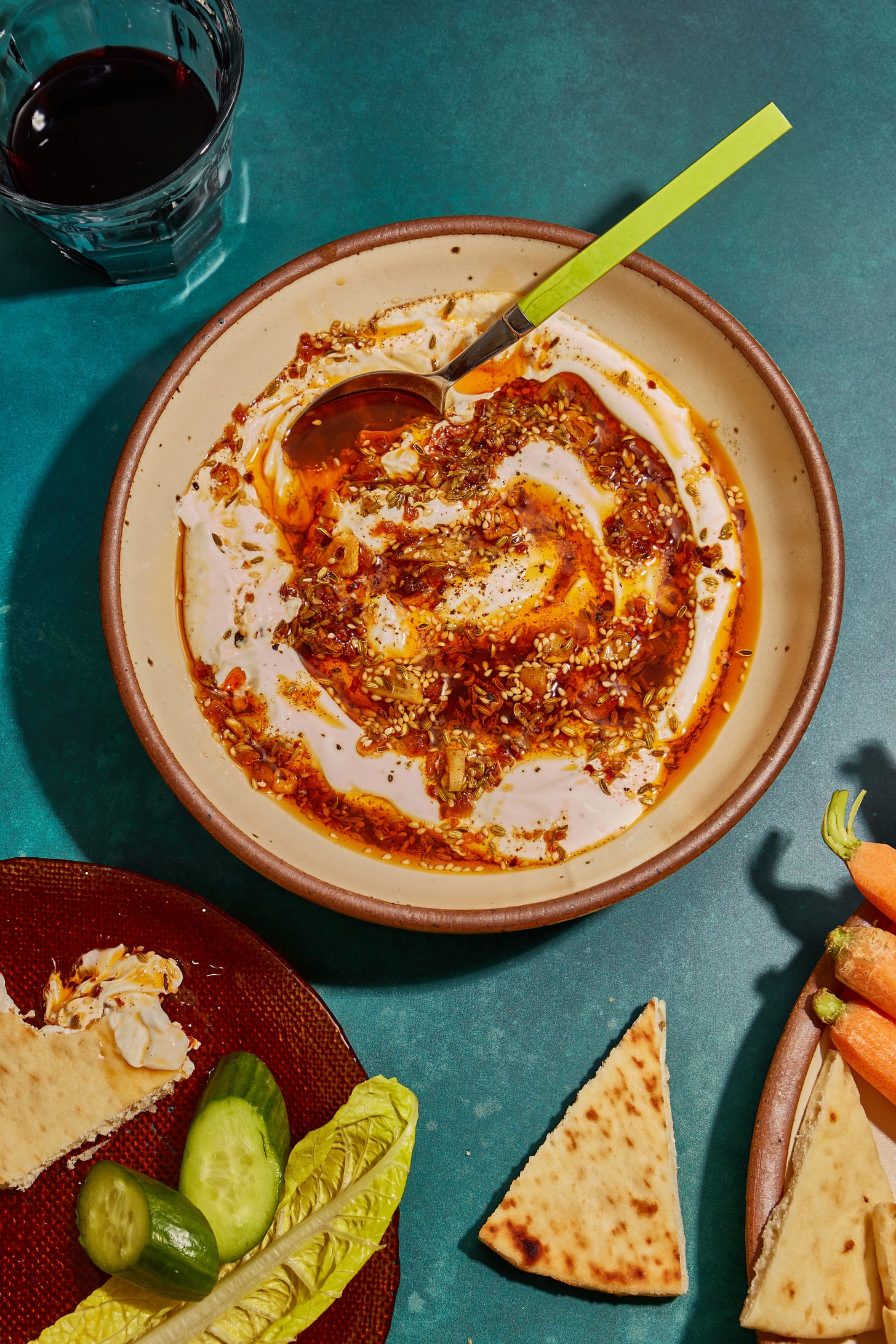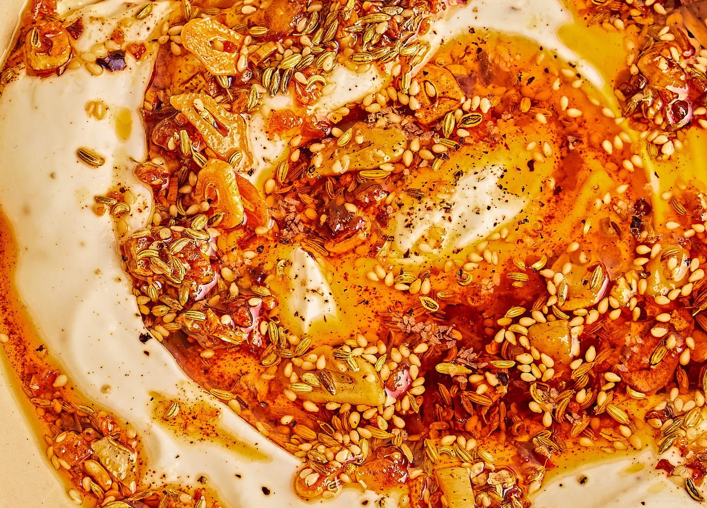 Taste and then add salt and pepper until you’re happy with it. If you’re adding the chili crisp oil on top, remember that that has salt in it too. Dump the yogurt mixture into your serving vehicle.