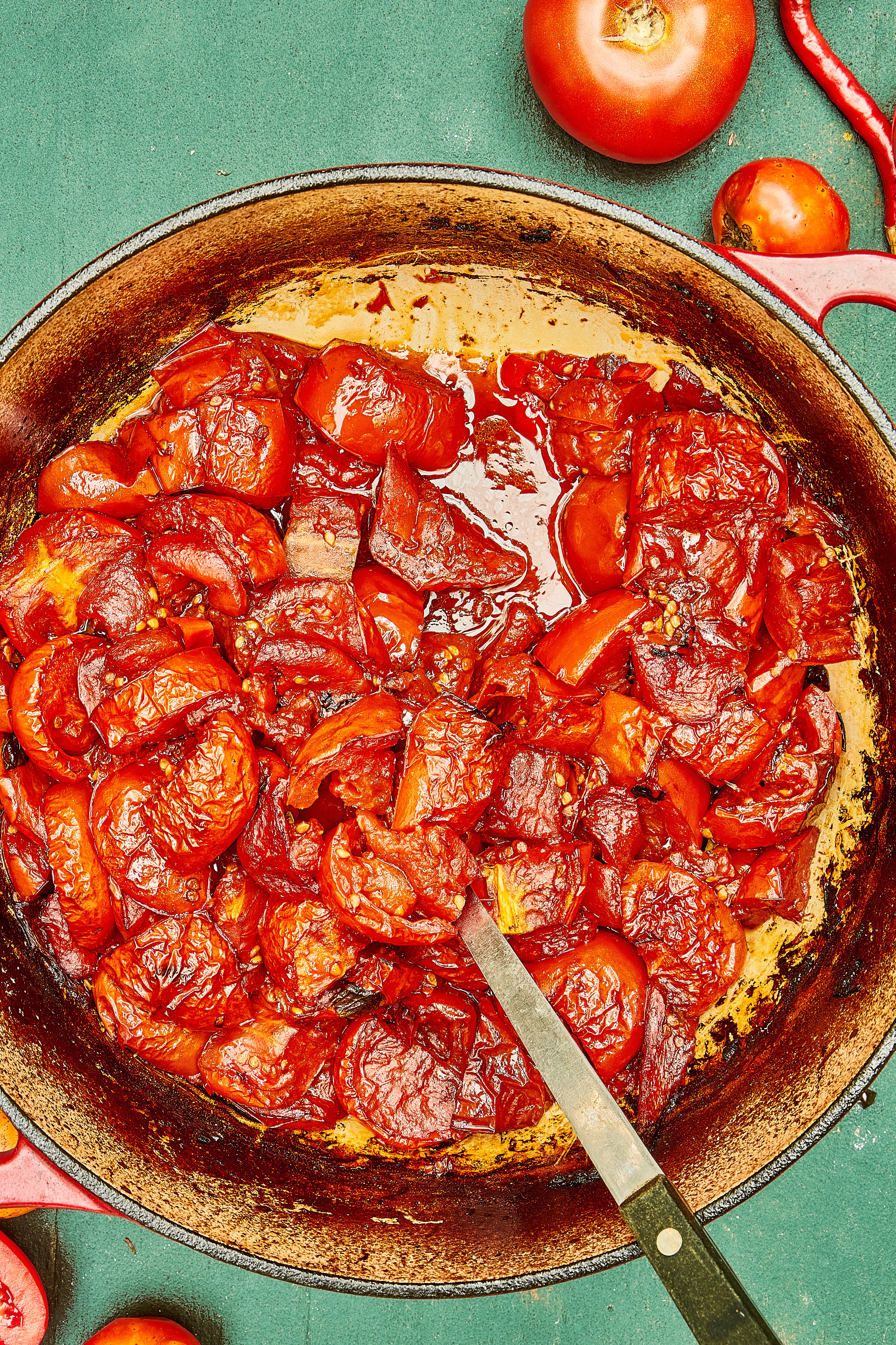 The last thing I’ll say before I let these tomatoes shine like the stars they are is that it’s worth seeking out an enamel-coated baking apparatus here. Metal cookware (aluminum in particular) can react with acidic foods like…everything I call for in this recipe, which will affect both the taste of the tomatoes and the longevity of your baking tins. I got my knock-off Dutch oven on Amazon, and I have absolutely zero regrets.